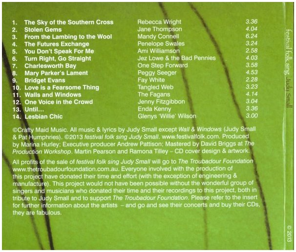 Judy Small is an Australian folk legend, and an openly lesbian one. Her music works commenting on social justice over the last thirty-plus years made her an icon in that country. And this year she received a couple of very deserved honors. The above various artists CD was released to honor some of her musical treasures, with contributions from an Aussie who’s-who of folk artists.