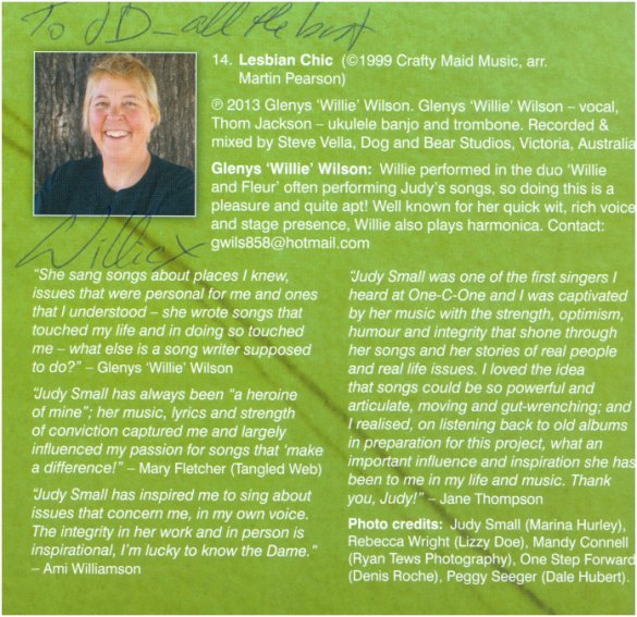 But, of course I want to tell you more about her music, and more about the tribute CD. It’s part of a new series of compilations, with others honoring Bob Dylan, Eric Bogle and Joni Mitchell, so Judy is in very good company. One of the lesbian-themed songs included, was done by Glenys ‘Willie” Wilson, who performed in the duo Willie & Fleur.